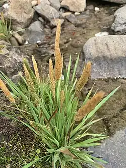 It is a perennial grass growing in tufts between 10 and 85 cm (3.9 and 33.5 in) tall. The small inflorescence is a few centimeters long and is a dense, cylindrical array of tiny spikelets, each up to about 3 mm (0.12 in) in length.