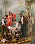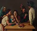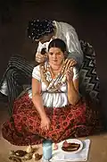 What distinguishes Arrieta’s work is its depiction of everyday life and customs in nineteenth-century Puebla: clothing, gastronomy, and small trades, as well as human virtues and defects, are the elements that are highlighted and repeated.[3] His works provide accurate portrayals of Mexican types such as the chinaco, the china poblana, the soldier, the water-carrier, the priest, the gentleman, the beggar, and many others. Arrieta was fascinated by mundane scenes such as the one depicted in his Tertulia de pulquería – set in one of the pulque bars of which there was no shortage in Puebla – or by street fights or market scenes, to which he lent a festive, anecdotal air. Other genre paintings by Arrieta include La sorpresa, La cocina poblana, Vendedores de horchata, and Agualojera.