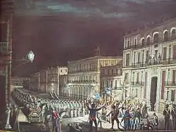 Some call Iturbide's decision a coup[3][23] and state that the public support for him was orchestrated by him and his followers.[3][8][14] Others insist that the people's offer of the throne was sincere, as there was no other candidate and the people were grateful to him for the liberation of Mexico. The latter accounts stress that Iturbide initially rejected the offer, in favor of persuading Ferdinand VII to change his mind about ruling Mexico, but then reluctantly accepted.[8] When the liberating army entered Mexico on 27 September 1821, the army sought to proclaim Iturbide as Emperor, which he himself stopped. A month later, on 28 October, he was publicly proclaimed Emperor by the people but again refused any such attempt.