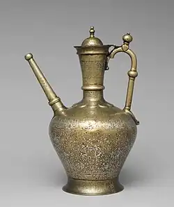 - The Cleveland ewer, made of brass and dated to 620 AH (1223 CE) and now on display at the Cleveland Museum of Art in the United States.[1]: 287 There are some later additions: the base, the lower part of the spout that attaches to the body, and "the lid and the uppermost ring of the neck".[1]: 287 It has been heavily weathered over time and most of its original silver inlay has been lost.[1]: 288 Two later owners, Ḥusayn ibn Qāsim and Ustā al-Muḥtasib (this name is less clear and the reading is uncertain), scratched their names into the ewer's neck.[1]: 288 At the bottom of the neck is al-Dhaki's signature and below that is a series of 10 raised semicircular spaces forming a "collar"; the decoration on these is badly worn.[1]: 288–9 The body of the ewer is decorated with a series of 30 medallions (10 each in three levels) on a background of arabesque patterns.[1]: 292 The 10 medallions in the central row include several depictions of hunting (including one where the hunters are shooting birds with a blowgun, which is one of only a handful of known depictions of this activity in Islamic art), an agricultural scene, a scene of two people riding camels with an unclear interpretation, a scene of musicians playing, a couple of pastoral scenes (including a unique one depicting a shepherd playing a flute), and a very unusual scene depicting a young man reclining on a couch in a "festive outdoor occasion".[1]: 293–8 The smaller medallions in the top and bottom rows all feature fairly typical "stock-in-trade motifs".[1]: 301
