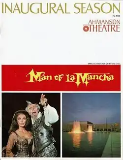 Welton Becket & Associates was the architect. Construction began on March 9, 1962 and was undertaken by Peter Kiewit & Sons (now Kiewit Corporation).[3] The theatre's inaugural event was held on April 12, 1967, with the Los Angeles Civic Light Opera Association sponsoring the national cast production of Man of La Mancha, starring Richard Kiley and Joan Diener.[4] The theatre also was the U.S. premiere of More Stately Mansions starring Ingrid Bergman, Arthur Hill, and Colleen Dewhurst, which opened September 12 of that same year.[5] Since then, it has presented a wide variety of dramas, musicals, comedies and revivals of the classics, including six world premieres of Neil Simon plays and works by Wendy Wasserstein, August Wilson, A.R. Gurney, Terrence McNally, John Guare and Edward Albee. The Ahmanson also has served in the capacity of co-producer for a number of Broadway productions, including Amadeus, Smokey Joe's Cafe, The Most Happy Fella, and The Drowsy Chaperone.