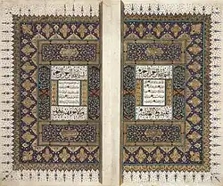 Some of the most impressive of the Mus'hafs prepared in the Ottoman Palace Studios have been attributed to Ahmed Karahisari.[6] His most important work is the Mus'haf which he penned for Suleiman the Magnificent (reigned 1520-1566), which is preserved today at the Topkapi Palace.[1] Other examples of his work are held in the Topkapi Museum and the Museum of Istanbul.[7][8]