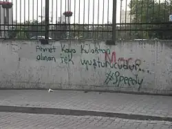 Following this announcement, he faced massive opposition from Turkish people and celebrities in the event.[18] First, Serdar Ortaç started singing a song with modified lyrics to boost nationalist feelings,[19] then people in the ceremony started singing 10th Year March. Later, Kaya was attacked by celebrities. Kaya's wife describes the attack as "All of a sudden, all of those chic women and men, they all turned into monsters, grabbing forks and knives and throwing them at us, insulting, booing. Imagine the atmosphere changing in just five minutes, almost a Kafkaesque transformation."[18]