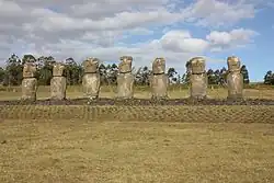 In 1955, Thor Heyerdahl recruited American archaeologist William Mulloy and his Chilean associate, Gonzalo Figueroa García-Huidobro, who later restored the statues to their original position; they had found them in knocked down condition in 1960.[1] Mulloy's work on the Akivi-Vaiteka Complex was supported by the Fulbright Foundation and by grants from the University of Wyoming, the University of Chile and the International Fund for Monuments. Ahu Akivi also gives its name to one of the seven regions of Rapa Nui National Park.[1]