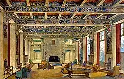 The interior design of the hotel also underwent several changes. Artist and interior designer Henry Lovins originally suggested a "Mayan revival" theme with Hispano-Moresque influences.[11] However, the husband and wife team of Arthur Upham Pope and Phyllis Ackerman was selected over Lovins.[36] Drawing on their experience as art historians, Ackerman and Pope created a style that mixed Art Deco, Native American, Middle Eastern, and Arts and Crafts styles.[41] The interior work was carried out by a number of artisans under their supervision. Much of the decoration originally used was Persian, and Ackerman and Pope would go on to become art consultants in Iran.[42]