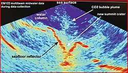 In late April 2014, Ahyi erupted, ending a 13-year dormancy period with an explosive eruption which lasted more than 2 weeks. At the time of the eruption, the remote location of the volcano and the presence of nearby volcanoes made it hard to understand the actual location of the eruption. The explosions were recorded by hydrophones in the region including in Wake Island and by seismographs including in Guam and Chichijima. Following May 8, acoustic waves from the events were observed until May 17. During the eruption, NOAA research divers and researchers on a ship near Farallon de Pajaros, around 20 km (12 mi) away from Ahyi, reported hearing explosions. In the same area, the NOAA crew observed orange-yellow bubbles covering parts of the sea surface. Despite these observations, satellite products did not show anything unusual throughout the whole eruption. During mid-May, an expedition on a NOAA ship which was planned to pass around the Ahyi eruption area was able to collect some samples and information about the eruption. Multibeam bathymetries were obtained at the same expedition. Comparison between 2003 and 2014 bathymetry proved that the summit depth of Ahyi had changed from 60 m (197 ft) in 2003 to 75 m (246 ft) in 2014. The bathymetry differences also revealed a new 95-meter-deep (312 ft) crater formed at the summit. South-southeast of the crater was a landslide trail towards the downslope with a deepest point of 2,300 m (7,546 ft). Plume particles were observed at three CTD casts of Ahyi.[8]