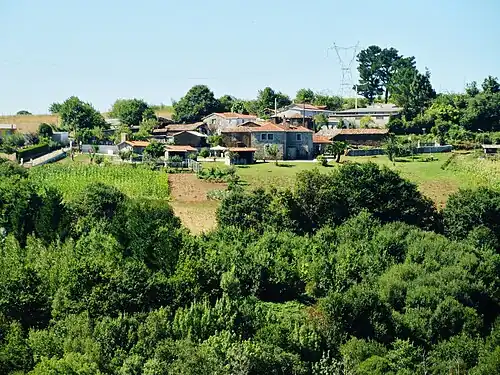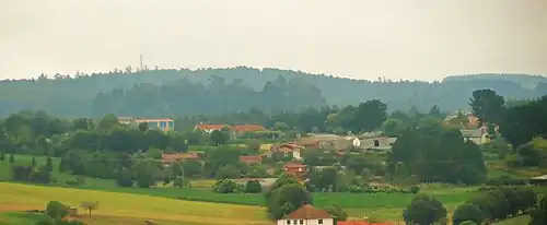 Aiazo is placed in the south-west of the municipality of Frades (Ordes' shire), 30 km driving from Santiago de Compostela and 50 km driving from Coruña. By the south, Aiazo borders with the Arzúa's shire, by the Tambre river; by the north and the east it borders with the rest of Frades, and by the west with the municipality of Oroso. The relief, characterized by the Maruzo river (in the north) and Tambre river (in the south), over a geological area determined by the schist complex of Ordes, forms a landscape with soft hills.[1] In Aiazo there are agrarian lands and forests around the populated areas. The forests are mostly of eucalyptus and pines in plantations, and Galician typical oak forest, with oaks, birchs, alders, willows, etc. Another frequent kind of forest in Aiazo is the riverbank forest near the Tambre, Gaiteiro, and Maruzo rivers. Maruzo's riverbank is part of the Río Tambre's ecological network Natura 2000, this protection will be increased in the future to the Tambre's riverbank. In the beginning, Aiazo's population was concentrated in the three principal neighborhoods, born around an aquifer. Historically Fontelo, Fonsá and A Devesa were the most important villages, the three with similar characteristics of terraced houses. To complement the three first settlements, country houses appeared, like Os Pereiros, in A Devesa, or O Casal, in Fontelo, and new settlements grew, like A Torre or A Carballeira. In the late 20th century, many isolated houses appeared, some of them following a ribbon development in the way between Ponte Carreira and Ordes, and other around the primary neighborhoods.[1] Population ageing is a phenomenon occurring in Aiazo, although in recent years the tendency has been to receive immigrants, especially because of the 2008 crisis.