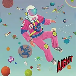 The cover art concept of Aight is outer space. The theme was chosen to liken the size of space to Jung's musical capacity.[6] It compromises illustrations of rockets, airplanes, and planets set against a mint-colored gradient background.[14] It also includes an Iris flower which stands for "the only love", a rabbit that symbolizes B.A.P's fandom, fireworks which signify the celebration of a new beginning, and a flock of birds that represent his fans. Jung is portrayed as an astronaut wearing a pink spacesuit, which replicates the color of his Kekemato bunny mascot from B.A.P. The suit contains a depiction of Ganji, Jung's pet Bichon Frise. It also bears the numbers "2-1" which denote part one of his second chapter as a soloist and the letters "J/L" for Jung Dae-hyun and Lionheart.[6] The album photography was shot my Moke Na-jung.[15] It shows Jung with a "natural" look, which he described as "mostly dreamy and fantasy-like".[6]