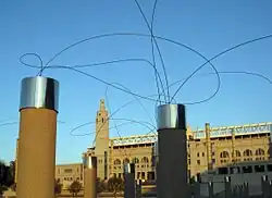 In March 1980, UTSUROI, the first work of Miyawaki's signature Utsurohi series was installed in Hikoda Children's Park in Ichinomiya, Aichi Prefecture.[1] In the Utsurohi series, Miyawaki attempted to achieve a form that excludes any sculptural weight. After a period of material search, she settled on steel wires for some time before discovering that piano wire, made of stainless steel, turned out best suited for her purpose. Through Mukai of Gallery Mukai, Miyawaki was introduced to Mr. Murayama who was the president of a company that makes piano wire. By shaping and suspending the wires in the air, the artist granted the sensation of motion to her work. The wires are both strong yet could also move at the slightest force such as a breeze. These sculptures negotiate with the immediate surrounding and can change in their forms in many ways, echoing the Japanese concept of "utsuroi," which points to "swift change," or "transience."[12][13]