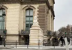 Immediately to the pavilion's west are two monumental sphinxes in white marble. They were manufactured in 1845 by the Cammi workshop in Carrara, installed in front of the Naval Library of Sevastopol, and seized there by General Aimable Pélissier in 1855 during the Crimean War. They were brought to Paris as war spoils and initially kept in the Louvre's Assyrian Room, then in front of the recently built Orangerie of the Tuileries, together with other Crimean war spoils. In 1867, on the occasion of Alexander II of Russia's visit of the Exposition Universelle, the sphinges were brought inside the Orangerie to avoid offending the Tsar's sensitivities; later that year, Louvre architect Hector-Martin Lefuel placed them on the sides of the entrance to the private garden of the Tuileries Palace, now part of the Tuileries Garden.[28] In 1877, the western sphinx was moved farther west when that entrance was replaced by the wider rue des Tuileries, now named after General Émile Lemonnier. It bears impacts of shots fired during the Liberation of Paris in August 1944.[29] The eastern sphinx was warehoused in 1986 during the remodeling of the avenue,[30] and reinstalled in August 2021.