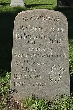 Following her death in 2018, a memorial stone featuring an image of 'Maisie of Morningside' was raised in Edinburgh's Grange Cemetery, on the site of her son Max's burial plot. The grave lies in the enclosed modern section to the west of the main cemetery.