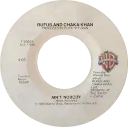 The song was included on the soundtrack album to the 1984 film Breakin'.[3] In 2000, VH1 ranked "Ain't Nobody" number 77 in their list of "100 Greatest Dance Songs".[4] In 2021, it was ranked number 403 on Rolling Stone's 500 Greatest Songs of All Time.[5] The song was adopted in the United Kingdom by fans of some of the country's football clubs, with the words: Ain't nobody loves (player), makes me happy, makes me feel this way.