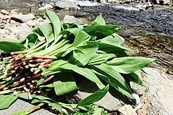 While men were responsible for hunting and fishing, women were responsible for gathering edible plants, beginning in early spring. Tools used during gathering trips into the mountains included the saranip (a bag woven from the fibers of the Japanese lime tree), the menoko makiri (a small women's knife), itani (a type of digging stick), and the shitap (a small pick made from deer horn).[2]: 367–374 One of the most important mountain plants gathered in spring was the Siberian onion (pukusa), which is very similar to wild leeks found in Canada and the United States in taste, texture, and appearance. Large quantities of Cardiocrinum cordatum bulbs (turep) were gathered in summer as they were important as a preserved food.