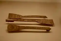 Food was transferred from the cooking pot using a ladle (kasup) into a lacquerware bowl (itanki) for eating. These bowls were obtained through trade with the ethnic Japanese and were large enough to hold 400 ml worth of food. Chunks of meat or fish that were too large to fit in the bowl were placed on mats woven from reeds.[2]: 406–420 Items such as fish roasted on a spit or sito were eaten by hand, but otherwise, most foods were eaten with chopsticks (pasuy) or spoons (parapasuy). Parapasuy translated literally means “wide chopstick”. Both spoons and chopsticks were carved from wood.[2]: 406–420