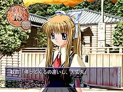 The second of the three heroines Yukito meets after Misuzu is Kano Kirishima, a girl attending the same school as Misuzu. She is usually energetic, playful, and tells jokes by saying nonsensical things. Kano is friends with a strange stray dog named Potato that follows her around and is able to communicate in his strange manner of speech.[14] Kano still believes in things she was told by her older sister Hijiri as a child as a way of coping with her past. The third and final heroine Yukito meets is a girl in Misuzu's class at school named Minagi Tohno, a top student in the school who is introverted as well. Until she met Yukito, her only friend was Michiru, with whom she often blows bubbles at the abandoned train station in town.