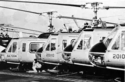 Air America Bell 205s being evacuated aboard USS Hancock, in 1975 - Budd RB-1 Conestoga