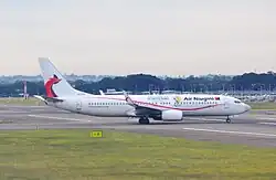 The aircraft was first delivered for Air India Express and was registered as VT-AXC on 19 April 2005.[2] On 6 July 2005, it was damaged in a runway excursion on landing at Cochin International Airport, India.[4] On 29 July 2010, the aircraft was sold to Jet Airways and registered VT-JBT. It was sold to CIT Leasing Corporation on 24 July 2013 and registered M-ABGK before being sold to Loftleidir, which leased the aircraft to Air Niugini on 13 September 2013, registered P2-PXE.[2][3] On 12 May 2018, it was struck by a Lockheed L-100 Hercules, registered as N403LC, of Lynden Air Cargo whilst parked at Port Moresby Airport, sustaining damage to its right winglet.[5]