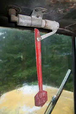 An automatic wig wag will rise out of view when the pressure in the system rises above the threshold. The manual-reset type must be placed in the out-of-view position manually. Neither will stay in place unless the pressure in the system is above the threshold. The photo shows a manual wig wag which the operator swings to the right out of view when the air pressure is above the threshold where it will remain as long as the pressure is sufficient.