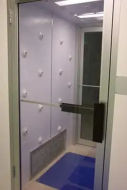 Air showers are generally constructed from cleanroom-compatible steel or plastic materials and feature electronically-powered blowers, filters and high-pressure jet nozzles, the latter being incorporated into the walls and ceiling of the chamber.[3] Air, at velocities of 3,000 ft/min (15 m/s) to 7,000 ft/min (36 m/s), continuously streams from the jet nozzles for 30–45 seconds, effectively removing loose particulate matter.[4] Personnel inside the enclosure will lift their arms and turn their bodies for uniform exposure to the air streams, a procedure usually specified in protocol. Air currents from the jets create shearing and flapping forces, which lift and remove contaminants from both flat surfaces and the creases of garments.[4] HEPA filtration within the air shower is capable of removing 99.97% of particles greater than 0.3 μm diameter.[5]