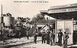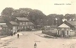 The CF du ARB remained behind Allied lines during World War I.[14] It fell within a security zone known as the Reserved Zone. Civilians living within this zone had free travel within the Canton in which they lived. To travel beyond their own Canton, or in and out of the Reserved Zone, a sauf-conduit (identity card) was required. Civilian passengers had to leave their train and go into the station building to have their papers checked when crossing Cantons. A procedure which led to complaints as some passengers missed their train when it departed whilst their papers were being checked. Military personnel had their papers checked on board the train. Services were reduced in frequency, with military and freight traffic taking priority.[15] Civilian services were reduced during the war, with further reductions inn 1917 and 1918.[16] In March and April 1918, Aire-sur-la-Lys came within shelling range of German artillery following gains made by the Germans during the Spring Offensive.[17] In late April, 296 Railway Company, Royal Engineers established a major depot at Rang-du-Fliers.[18] This included a repair facility for both standard- and metre-gauge locomotives. Aire-sur-la-Lys was bombed on 16 May, but damage to tracks was repaired within 24 hours.[19] In August, a chord was laid at Gourgesson Junction enabling trains to run directly between Aire-sur-la-Lys and Anvin without reversing.[18]
