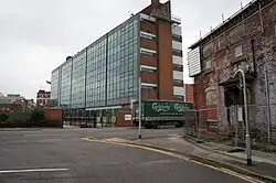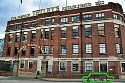 Hunslet is now an inner-city area of Leeds immediately south of Leeds railway station, bounded on the north and east by the River Aire. It was a rural village until rapid growth during the 19th century as a result of the Industrial Revolution.[1] The area between Meadow Lane and Crown Point Road became the brewery of Joshua Tetley and Son in 1822,[2] which was replaced by the construction of a new brewery designed by George Corson began in 1852.[3] By 1860 Tetley was the largest brewery in the North of England, and in 1931, the Art Deco Tetley headquarters building was erected. Tetley's was fully taken over by Carlsberg in 1998, which had owned 50% since 1993, who announced the brewery's closure in 2008, with the final brew taking place in 2011 and lager production transferring to Northampton.[3]