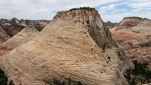 Aires Butte is a 6,492-foot (1,979 m) summit located in Zion National Park, in Washington County of southwest Utah, United States. It is composed of white Navajo Sandstone, and rises 1,100-foot (340-meter) above the Zion – Mount Carmel Highway. Aires Butte is situated 0.9 mi (1.4 km) east-northeast of Ant Hill, 1.5 mi (2.4 km) north of Nippletop, and 1.9 mi (3.1 km) northwest of Checkerboard Mesa. Precipitation runoff from this mountain drains into tributaries of the Virgin River.