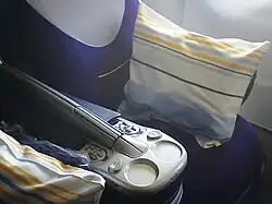 An airplane "aisle chair" is a mobile seat provided by airlines for passengers who require the use of a wheelchair. While most trains, buses and other forms of public transportation have space for a passenger's own wheelchair for seating and a ramp or lift assist for boarding, airplane aisles are too narrow for conventional wheelchairs. The aisle chair affords the wheelchair passenger assisted mobility in boarding and disembarking, and in-flight movement within the cabin such as to the lavatory.[22]
