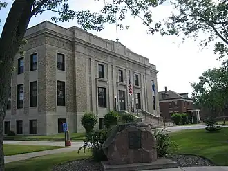 The Aitkin County Courthouse and Jail, in Aitkin, Minnesota, United States, serves as the county seat of Aitkin County. The building is actually the second courthouse for the county. The first courthouse was built in 1888, but in 1920, a grand jury reported that the building was dangerous and "falling apart". After difficulties securing financing, the county commissioners approved a plan for a new courthouse, which was finished in 1929. The design mixes Beaux-Arts architecture and Moderne elements. The interior features marble wainscoting, oak woodwork, terrazzo floors, and stained glass skylights.[2]