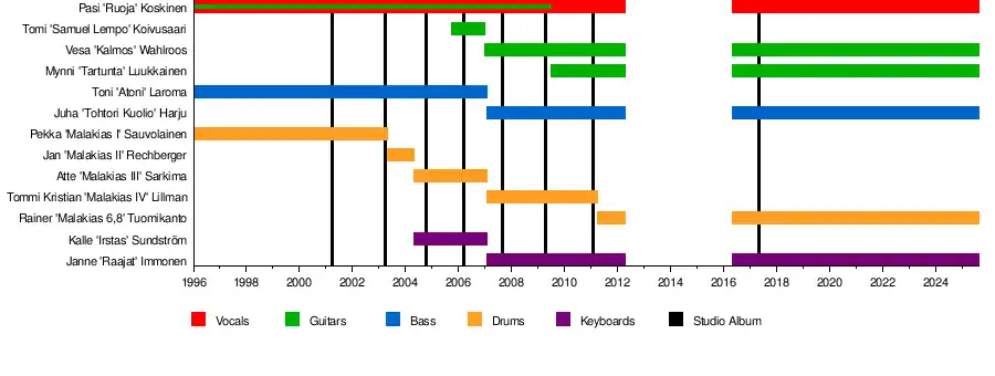 - Ruoja ― lead vocals (1996-2012, 2016-present) rhythm guitar (1996—2009); studio keyboards (1996—2004)