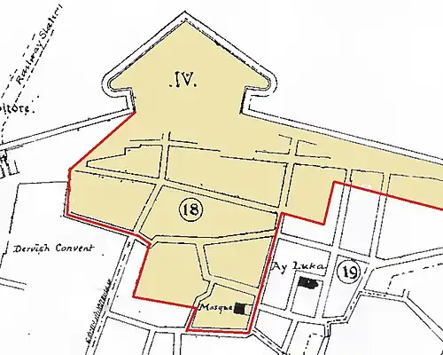 Ak Kavuk is one of the 24 historic Neighbourhoods of Nicosia within the walls.[2] After the Ottoman conquest of Nicosia, it was divided into 12 quarters said to be derived from the 12 generals in command of divisions of the Ottoman army at the time. Each general being posted to a quarter, that quarter was known by his name. In this case the Quarter was named after General Ak Kavuk Pasha. (This is a nickname meaning "white cap.").[4]