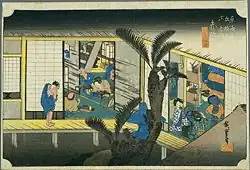 Along with the preceding Yoshida-juku and Goyu-shuku, Akasaka-juku was well known for its meshimori onna. The classic ukiyo-e print by Andō Hiroshige (Hoeido edition) from 1831–1834 depicts a typical inn; the scene is divided in half by a sago palm in the center. To the right, travellers are taking their evening meal, and to the left, prostitutes are putting on make-up and preparing for the evening entertainment. Due to its reputation, Akasaka was a popular post station with many travellers.[1]