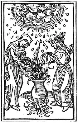 Hallucinogens were commonly used during the rite in order to achieve ecstasy. It was dangerous to calculate the right dose when the used quantities approached the lethal quantity, and that is why some substances started being applied as an ointment in the vagina or in the anus. This could have given rise to notions of a sexual element in witch practices and/or the use of cauldrons to prepare magic potions and salves. It is possible that the ointment was applied to the vagina with a staff and this might explain the frequent depiction of witches as flying with a broomstick between their legs. Some species of toad are poisonous if they come in contact with human skin. The toad's skin is also a hallucinogen, and they also appear in popular beliefs. The same could happen with poisonous mushrooms, such as amanita muscaria.