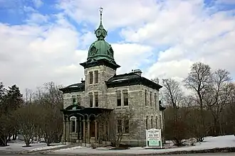 The Akin Free Library was a gift from the Quaker Albert J. Akin (1803–1903), founder of the Bank of Pawling and the Mizzentop Hotel on Quaker Hill.[2] The building was designed by the architect John A. Wood and constructed between 1898 and 1908. It is a 2½-story, T-plan, stone building on a raised basement with an engaged three-story central clock tower and rear annex. The building features an entrance portico, bracketed sheet copper cornice, and standing seam copper roof. Its design is Victorian eclectic.[3]: 2, 5