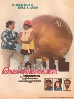 Akkareyakkareyakkare, also known Akkare Akkare Akkare (transl. Far Far Away) is a 1990 Indian Malayalam-language buddy cop comedy film directed by Priyadarshan and written by Sreenivasan. It stars Mohanlal, Sreenivasan, M. G. Soman, Mukesh, Maniyanpilla Raju, Parvathy and Nedumudi Venu in major roles. It is a sequel to 1987's Nadodikkattu and 1988's Pattanapravesham; Mohanlal and Sreenivasan reprises their roles. However, Thilakan, Mamukkoya and Innocent, who have appeared in the previous films, do not appear in this film. Also, a new cast of Nedumudi Venu, Sukumari, Parvathy Jayaram, Jagadish, Mukesh and Maniyanpilla Raju appears. M. G. Soman plays a character role, having appeared as himself in Nadodikkattu. The story follows C.I.Ds Dasan and Vijayan on an investigation for a gold crown stolen to the United States.[1]