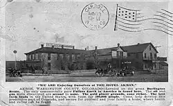 Akron was platted in 1882.[9] Originally, Akron was a small camp on the railroad, being halfway between McCook and Denver.[10] The community was named after Akron, Ohio, the native home of the wife of a railroad employee.[11] The Akron, Colorado, post office opened on January 30, 1883.[12] Washington County was created on February 9, 1887, with Akron as its first and only seat.[2] The Town of Akron was incorporated on September 22, 1887.[1]