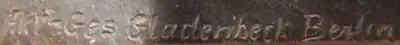 The Aktien-Gesellschaft Gladenbeck foundry opened for business in 1851[2] in Berlin, Prussia, under the leadership of its founder, Carl Gustav Hermann Gladenbeck.[3] It was one of the most important foundries in Germany, known for its high quality bronze castings.[1] Some of the first bronze sculptures that emerged from the foundry were marked "Gladenbeck" with subsequent castings over the years being marked "Gladenbeck und Sohn", "Akt-Ges v.H. Gladenbeck", "Akt-Ges Gladenbeck Berlin" or "Aktien-Gesellschaft Gladenbeck".[3]