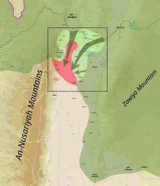 The campaign consisted of a three-pronged attack, with the two main assaults spearheaded by Ahrar ash-Sham, al-Qaeda's al-Nusra Front, and other Sunni Islamist factions under the banner of the Army of Conquest, and the remaining attack force including collaboration with Free Syrian Army groups.[32] The commander of the 13th Division, affiliated with the FSA, stated that coordinating with other groups such as al-Nusra Front did not mean they were aligned with them.[2] Within days, the rebels captured the city of Jisr al-Shughur and later on an Army base.[29] The success of the campaign was attributed to better coordination between the Syrian opposition's backers.[33][34] Still, the operation resulted in a high attrition rate for both sides.[29]