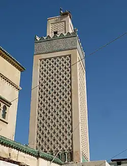 ![]() The minaret of the al-Hamra Mosque, standing over the Grande Rue of Fes el-Jdid. | |