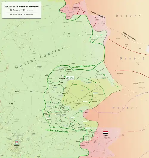 The Al Jawf offensive was a Houthi offensive that began in February 2020 with clashes in the Al Jawf Governorate during the Second Yemeni Civil War. Houthi forces were able to decisively capture the town of Al Hazm on 1 March 2020 from the Hadi government.[20][21][22] On 27 April, the first phase of the offensive ended with the Houthis capturing 3,500 square kilometers of territory in Al Jawf Governorate.[23] After reinforcing, the Houthis launched the second phase of their offensive on 27 May, making further advances toward the city of Marib and capturing the Maas military base on 20 November, 2020.[10] The Houthis halted the offensive on 5 February 2021, in order to account for changes in the Saudi-led coalition and Southern Transitional Council.[2] After reinforcing once more, the Houthis launched a new offensive towards Marib city on 7 February.[24]