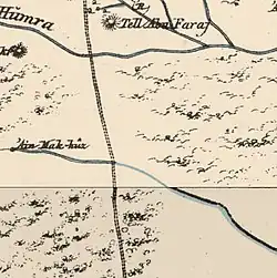 In 1992 it was described: "The only remaining landmarks is a cemetery on Tall Abu al-Faraj (199/203), north of the site. To the north and the west of this tell are the springs of 'Uyun Umm al-Faraj and 'Ayn al-Khanazir. Most of the village site and the land around it are covered with palm trees."[5]