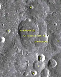 By convention these features are identified on lunar maps by placing the letter on the side of the crater midpoint that is closest to Al-Khwarizmi.