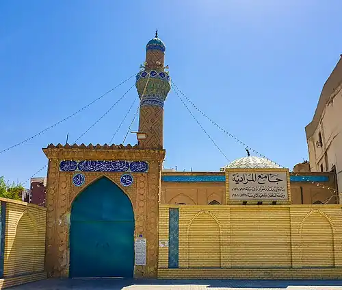 Murad Pasha Mosque (Arabic: جامع مراد باشا), also known as al-Muradiyya Mosque (Arabic: جامع المراديه), is an old mosque located opposite the old Ministry of Defense named after Kuyucu Murad Pasha who also built it. The mosque consists of a wide chapel surmounted by a flattened semi-spherical dome. It was decorated with simple motifs of Kashani, and besides it are six small and flat domes as well. In the northwest corner there is a minaret or minaret, which is also built of stone and decorated with colored decorations and stalactite.[14] Currently, the mosque is considered a heritage and was renewed in 2009 at a time when most religious buildings in Baghdad were suffering from neglect.[16]