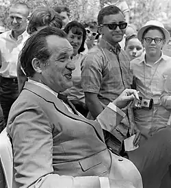 In August 1919, at age nine, Capp was run over by a trolley car and had his left leg amputated above the knee.[5] According to his father Otto's unpublished autobiography, young Capp was not prepared for the amputation beforehand; having been in a coma for days, he suddenly awoke to discover that his leg had been removed.[6] He was eventually given a prosthetic leg but only learned to use it by adopting a slow way of walking which became increasingly painful as he aged.[7] The childhood tragedy of losing a leg likely helped shape Capp's cynical worldview, which was darker and more sardonic than that of most newspaper cartoonists.[8] "I was indignant as hell about that leg," he revealed in a November 1950 interview in Time magazine.[8]