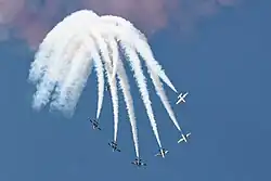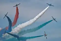 Fursan Al Emarat (Arabic: فرسان الامارات; lit. 'The Knights of the Emirates') is the Aerobatic display team of the United Arab Emirates Air Force and Air Defence. It was formed in 2008 with Italian-built Aermacchi MB-339NAT jet aircraft.[1] The team has a total of seven aircraft that symbolizes 7 Emirates, all seven of which are used for international airshows, locally they started their first show at Dubai Airshow and flew at the IDEX and Abu Dhabi Formula 1 Grand Prix and across the 7 emirates for 2 December National day celebrations, internationally the team has performed at LIMA exhibition and their upcoming Airshow performance will be at Royal International Air Tattoo.