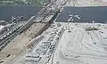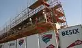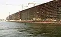 To solve the major traffic problems caused by the old bridge, a replacement was constructed between 2006 and 2008 by Belgian main contractor BESIX.[4] The bridge, which cost 415 million dirhams,[2] is meant to add more lanes of road that cross Dubai Creek. The new Al Garhoud Bridge has a total of 14 lanes, 7 in each direction.[2] It is able to handle 16,000 vehicles per hour.[2] Construction of the bridge began in February 2006 and by 26 September 2007, 76% of the construction was completed.[2] The bridge is 520 m (1,706 ft) long and 16 m (52.5 ft) above the water.[2] On 15 December 2007, four lanes on the Deira-bound side were opened to vehicle traffic.[5] Then on 15 March 2008, as had been scheduled,[2] remaining lanes on both sides were opened.[6] The old bridge was demolished after the new bridge opened.[3][5] Shortly after the bridge opened, the Roads and Transport Authority announced that Al Garhoud Bridge would be decorated with artwork that look like sand dunes during the day and waves at night with the aid of lighting.[7]