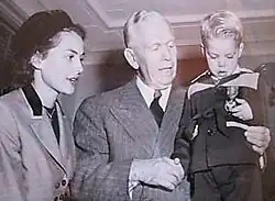 A sequel, Jolson Sings Again (1949), opened at Loew's State Theatre in New York and received positive reviews: "Mr. Jolson's name is up in lights again and Broadway is wreathed in smiles", wrote Thomas Pryor in The New York Times. "That's as it should be, for Jolson Sings Again is an occasion which warrants some lusty cheering."[65] Jolson did a whirlwind tour of New York film theaters to promote the movie, traveling with a police convoy to make timetables for all showings, often ad libbing jokes and performing three songs for each audience. Extra police were on duty as crowds jammed the streets and sidewalks at each theater Jolson visited.[66] In Chicago, a few weeks later, he sang to 100,000 people at Soldier Field, and later that night appeared at the Oriental Theatre with George Jessel where 10,000 people had to be turned away.[67]