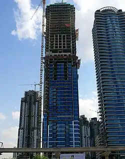 The Al Tayer Tower, aka Manazel Al Safa Tower, is a 59-floor residential tower in Dubai, United Arab Emirates. Its location along Sheikh Zayed Road gives it close proximity to Downtown Dubai (the district that includes the Burj Khalifa and the Dubai Mall) and Business Bay. The design of the tower was completed in 2005,[1] but ground works did not begin until Spring 2006. The building began to rise above ground level in December 2006. The first glass was put on the building in April 2007, but this was only two windows. Not until September did major cladding begin. Tower will have a total of 244 apartments that come in various sizes.[1] Built behind the tower will be an 11-floor parking garage, also built by Al Shafar General Contracting Co. LLC.[4]