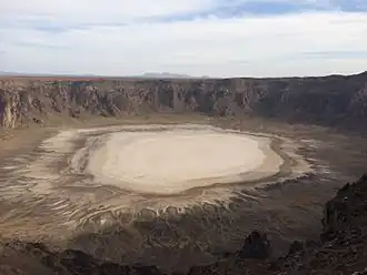 The Harrat Kishb plateau[1][2] contains many volcanic cones. It is 250 m (820 ft) deep and two kilometres (1+1⁄4 miles) in diameter. The bottom of the crater is covered with white sodium phosphate crystals.