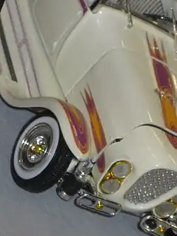 The chassis was painted Swedish White Pearl with purple and gold scallops, matching the body.[17] All the chrome work on the underside was done by Gejeian's friend, Bob Martin, at his Fresno shop for free, in exchange for the publicity for Fresno Chrome Plating.[18] Body modifications (except the grille shell, which was aluminum) were done entirely in 20 gauge steel.[6]