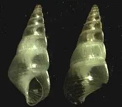 (Described as Rissoa melanura) The shell is conic and turrited. It is white and subtransparent with a black apex. It is nearly smooth and is shining. It features some spiral striae that are distinct anteriorly and on the lower part of the whorls of the spire, but obsolete on the upper part. The apex is acute, and the spire has nearly rectilinear outlines. There are eight quite convex whorls with a rather deep suture. The aperture is scarcely effuse, and the outer lip is thin and well-excurved below the middle. The columella is straight and subtruncate.[2]